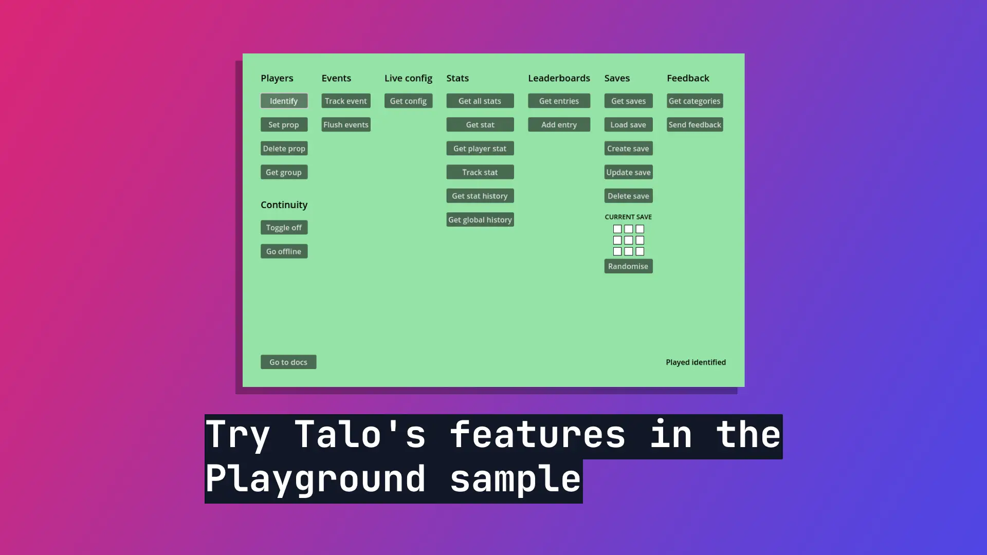 - ๐ฎ Playground: a text-based playground allowing you to test identifying, events, stats and leaderboards
